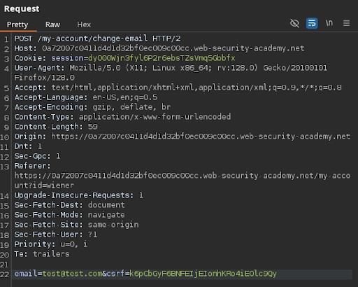 En este laboratorio tenemos dos usuarios distintos, cada uno con sus credenciales correspondientes: wiener:peter y carlos:montoya Abrimos dos pestañas y, tras interceptar una petición de cambio de correo para cada usuario, comprobamos lo siguiente: