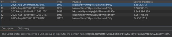 Si a continuación nos dirigimos a la sección Collaborator en Burp Suite y revisamos las solicitudes recibidas, podemos observar lo siguiente: