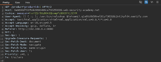 Si nos dirigimos a la página inicial e interceptamos una recarga, podemos observar el encabezado Referer. Podemos probar colocando directamente la dirección URL del Burp Collaborator, por ejemplo: Referer: https://0abmuswu9df8ca18assltggnmes5gv4k.oastify.com.