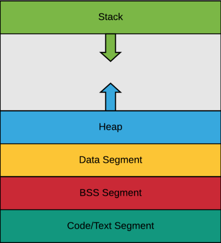 Los dos últimos segmentos (Heap y Stack) se encuentran contiguos. Debido a esto, y a que su tamaño varía durante la ejecución del programa, es posible que ocurran desbordamientos de buffer si algún buffer excede los límites establecidos.
