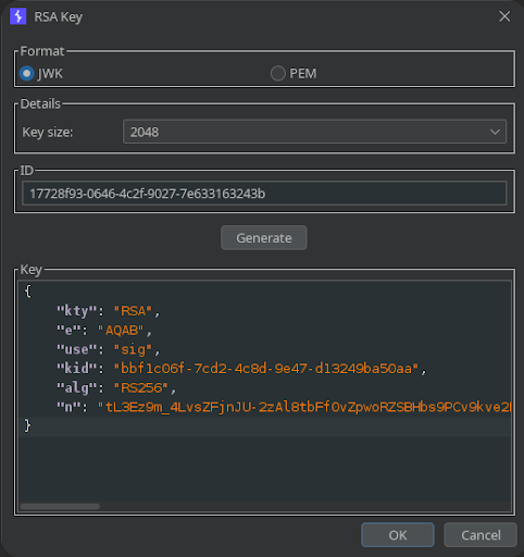 Por ello, lo que podemos hacer es ir a BurpSuite, crear una nueva clave asimétrica RS256 y en la parte de clave pública pegar la del servidor de la siguiente manera: