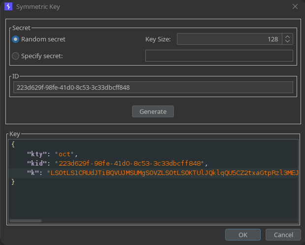 A continuación, nos copiaremos la clave pública en formato PEM de esa nueva clave RS256 (es decir, la clave pública del servidor), la codificaremos en Base64 y crearemos una nueva clave simétrica, donde en el valor de K (key/secreto) pondremos la clave pública en formato PEM codificada en Base64.