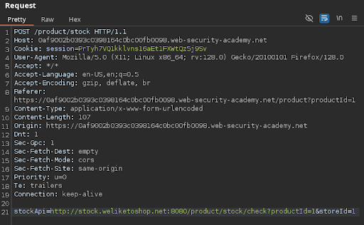 Si volvemos a consultar el stock de un producto y capturamos la petición con BurpSuite, observamos nuevamente el parámetro stockApi realizando una llamada a una URL, de forma similar a laboratorios anteriores.
