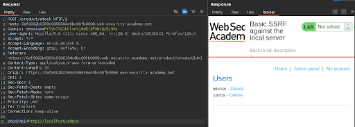 Por lo tanto, si tramitamos una petición utilizando el parámetro stockApi hacia la dirección http://localhost/admin/delete?username=carlos, conseguiremos completar el laboratorio, ya que se elimina al usuario Carlos.