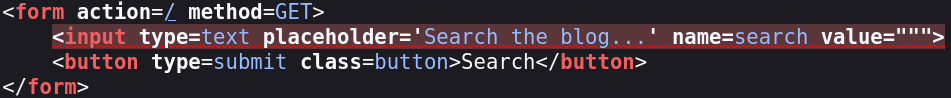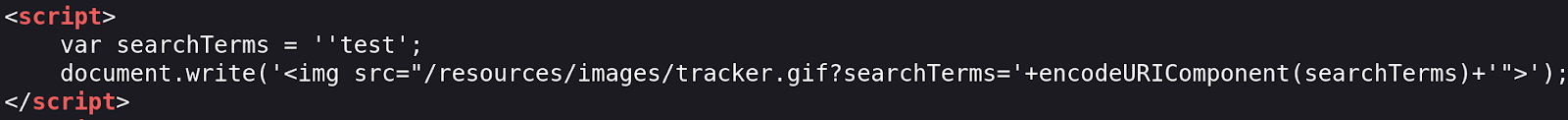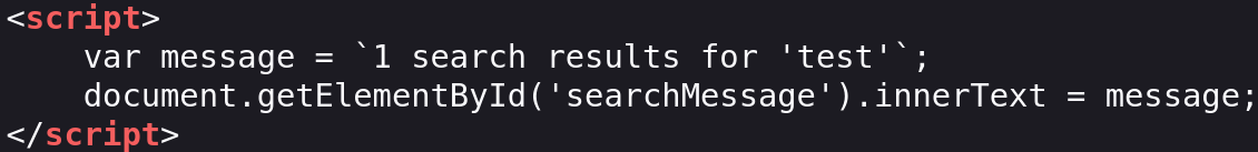 Si introducimos un valor como test y revisamos el código fuente de la página, podemos ver que se está almacenando en una variable llamada searchTerms.