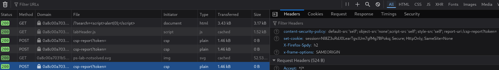 - Lab 30: Reflected XSS protected by CSP, with CSP bypass